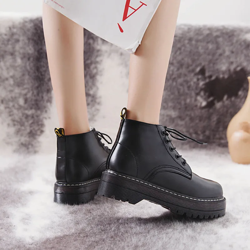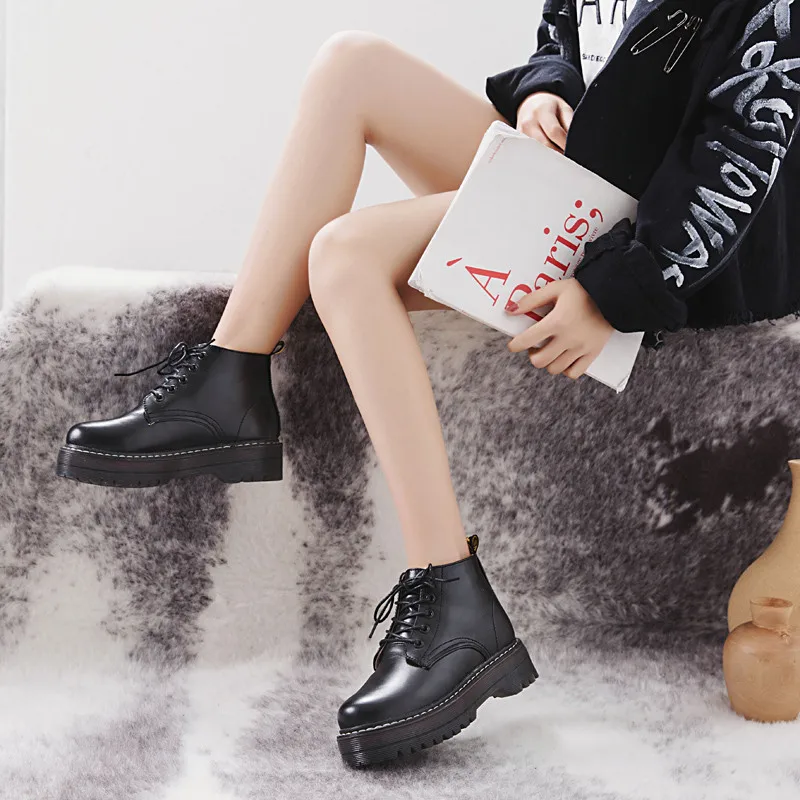 Cootelili Fashion Zipper Flat Shoes Woman High Heel Platform Pu Leather Boots Lace Up Women Shoes Ankle Boots Girls 35-40