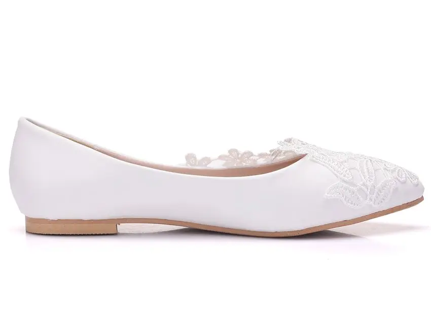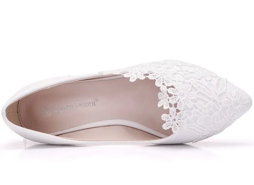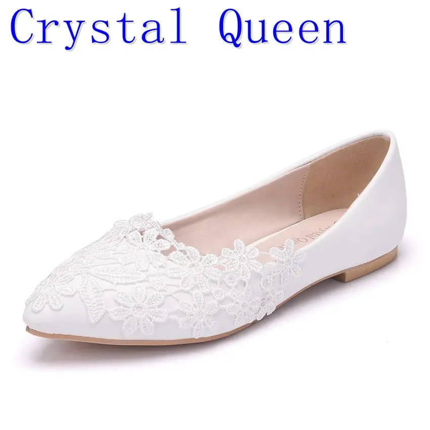 Crystal Queen Ballet Flats White Pearl Lace Wedding Shoes Flat Heel Casual Shoes Pointed Toe Flats Women Wedding Princess Flats
